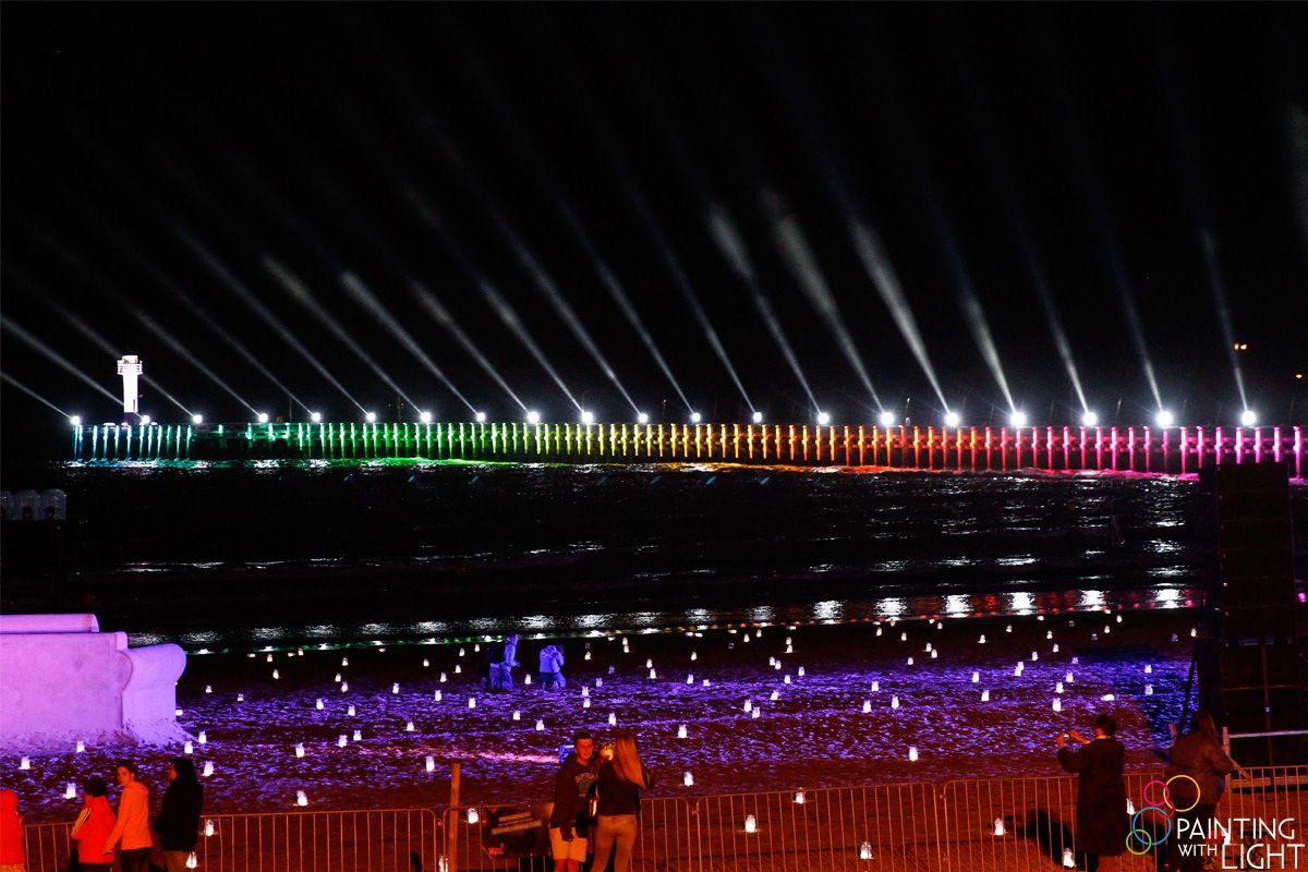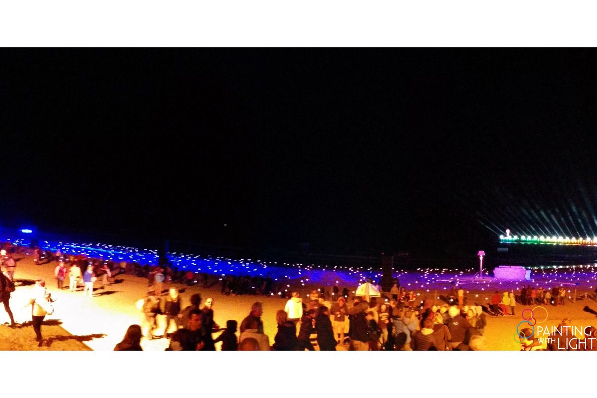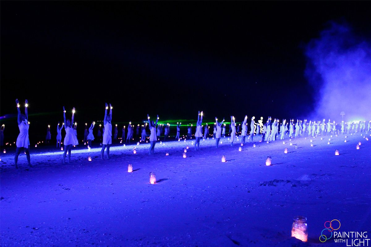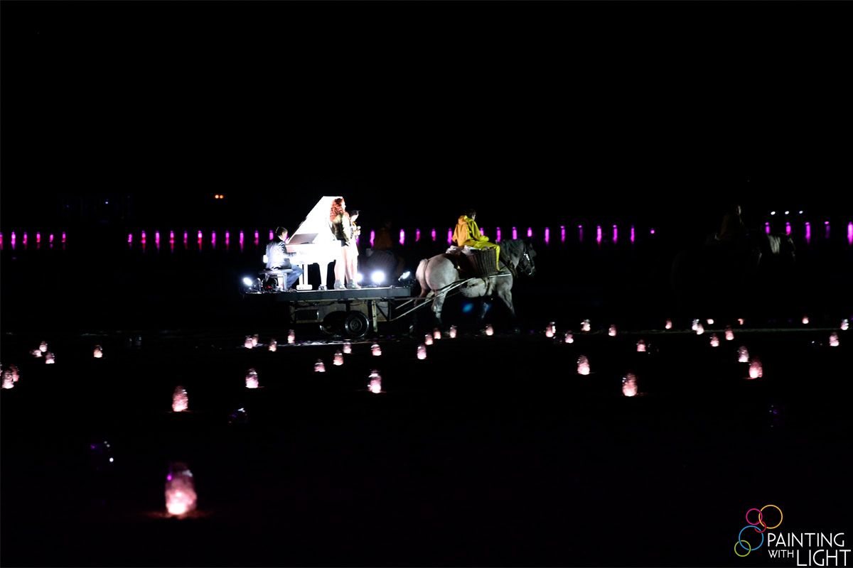Painting With Light used numerous Dome Surround Lights to create small candle-like effects across the vast beach area. These are wireless and controllable via a light table and also acted as ‘prompt’ lights for the dancers and actors in the show , creating almost imperceptible waves of colour changing lights throughout the show. They also programmed the video content appearing on the water screen. A major challenge was the seaside weather conditions!