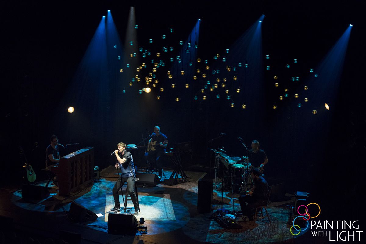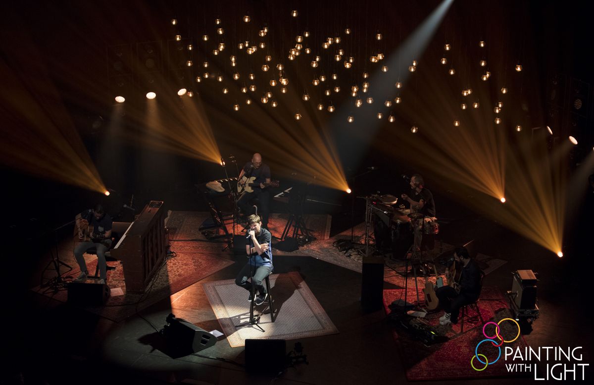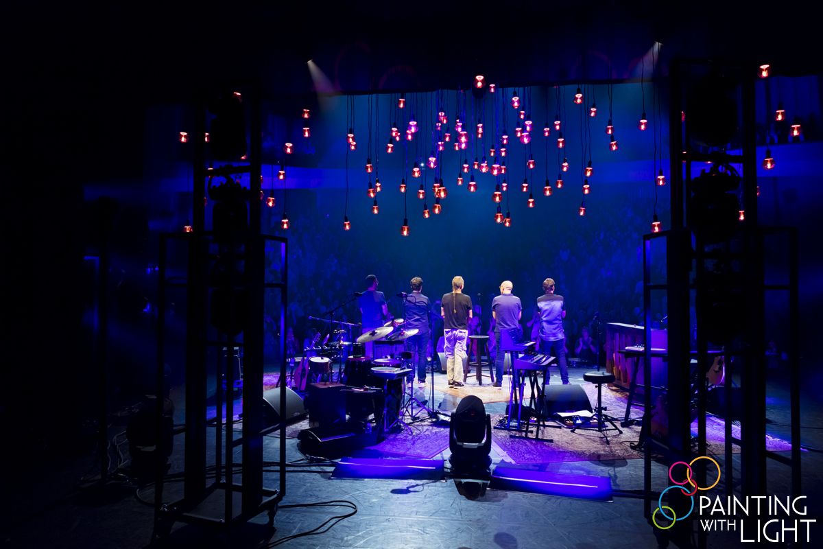 Each bulb is individually controlled via the lighting desk, and the 120 lightsources are hung above the band on six bespoke 1.6 metre diameter metal circles, each accommodating 20 bulbs on the ends of slim steels.