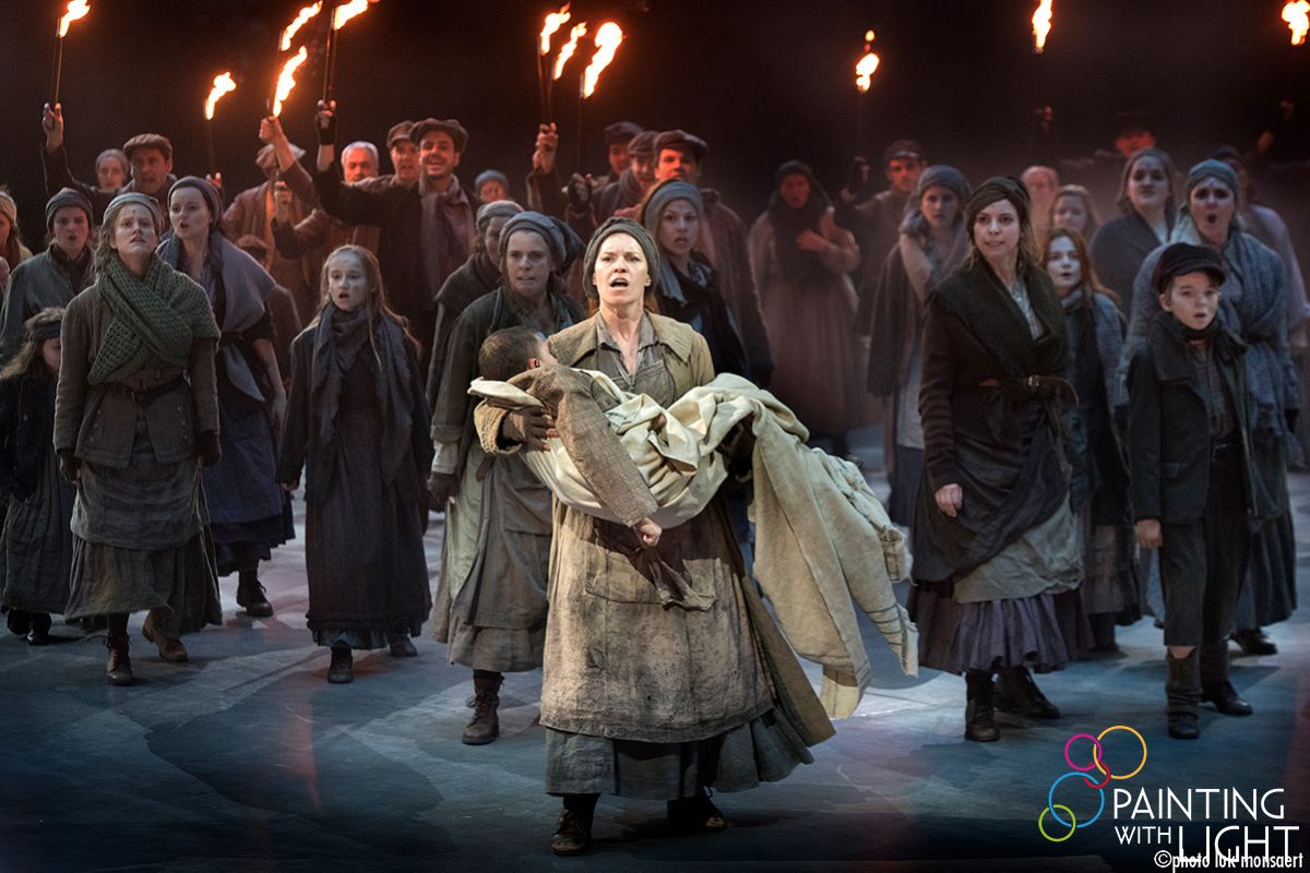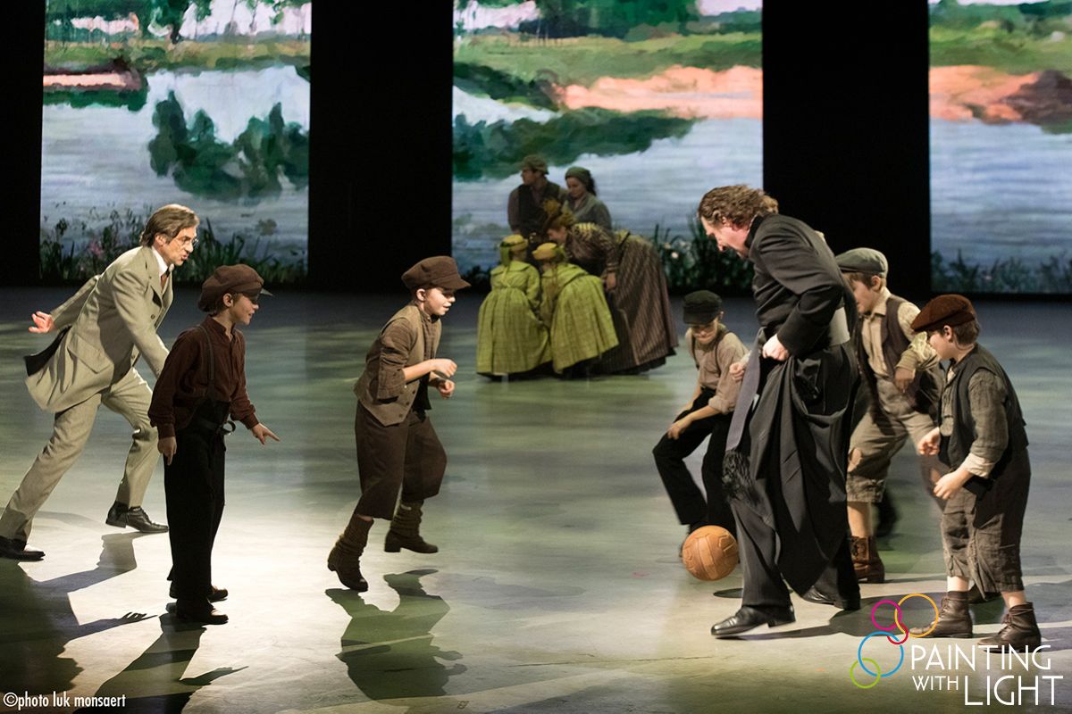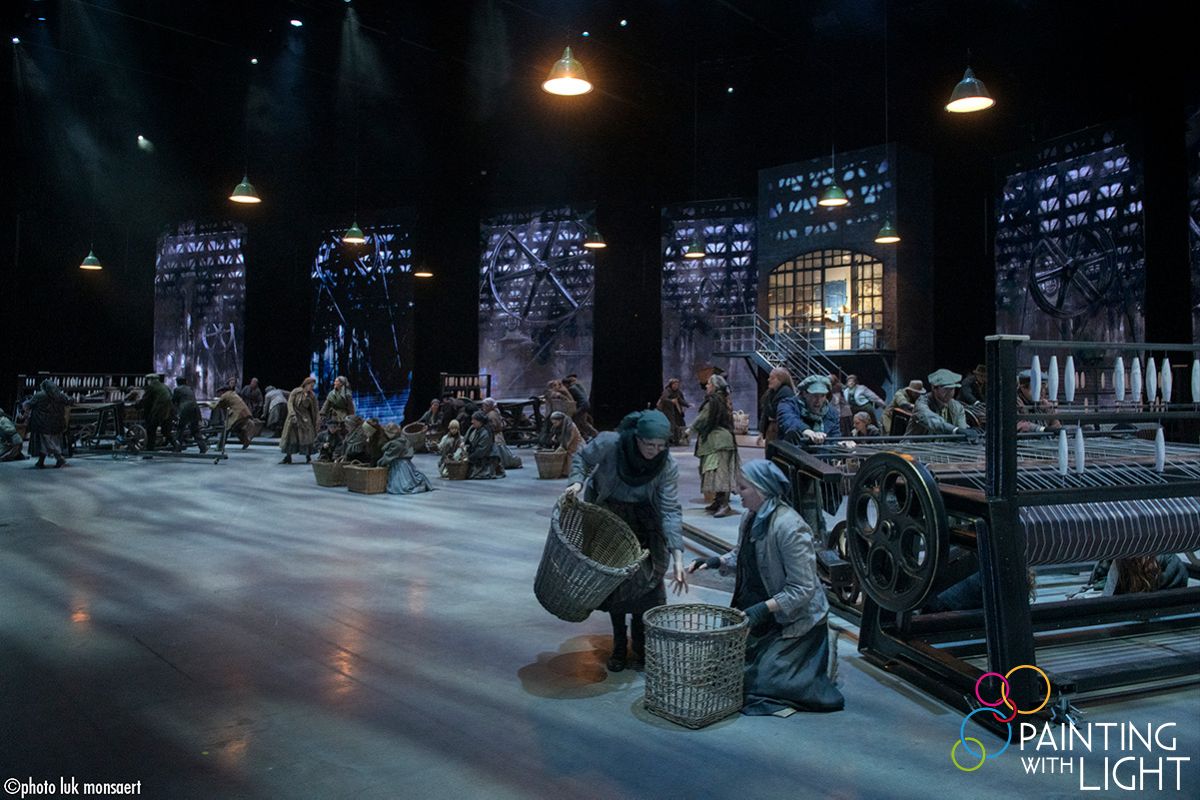 The plateau is meticulously transformed by the light design and the orchestrating stands. The spectators are taken from a station environment, where a real train drives into the theater, to the factory where kids and women are forced to work in unhealthy conditions, into a minuscule setting in which the audience is literally feeling the breath of the actors.