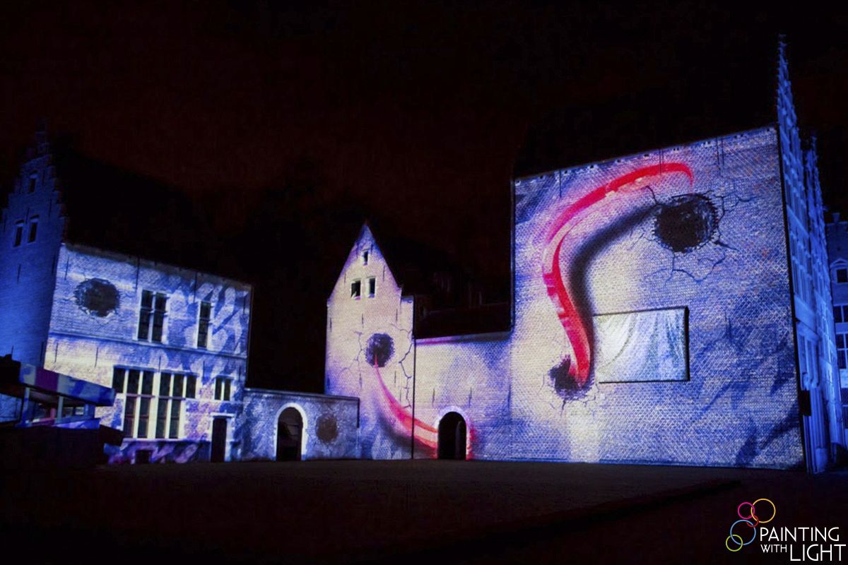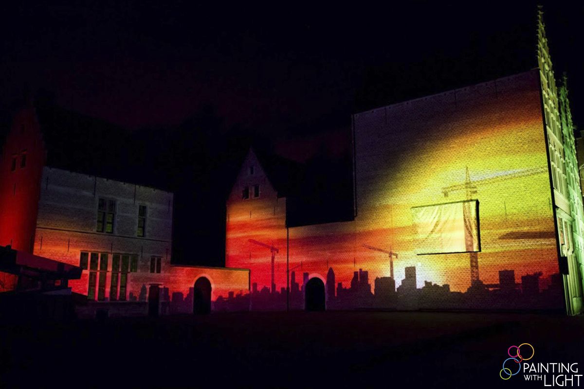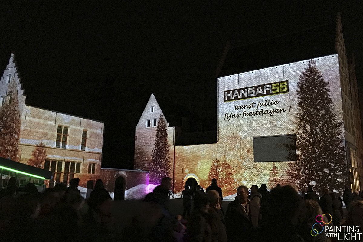 As an extra advantage for Hangar 58 we set a fixed installation for D3 mapping. It is now possible for tenants of Hangar 58 to personalize their event. We created a unique option in the Old City. Whenever you rent the hangar for an event or party you can use available settings such as loops, decors and others. This provides an extra personal and unique touch to your event. The video content itself can be adapted for a minimum cost per event. This creates a decor with added value for parties and events in Hangar 58, a value that augments experience. Guests can view the show through the large glass walls of the modern Hangar 58 in the winter and enjoy the large format show standing outside in de summer evenings.