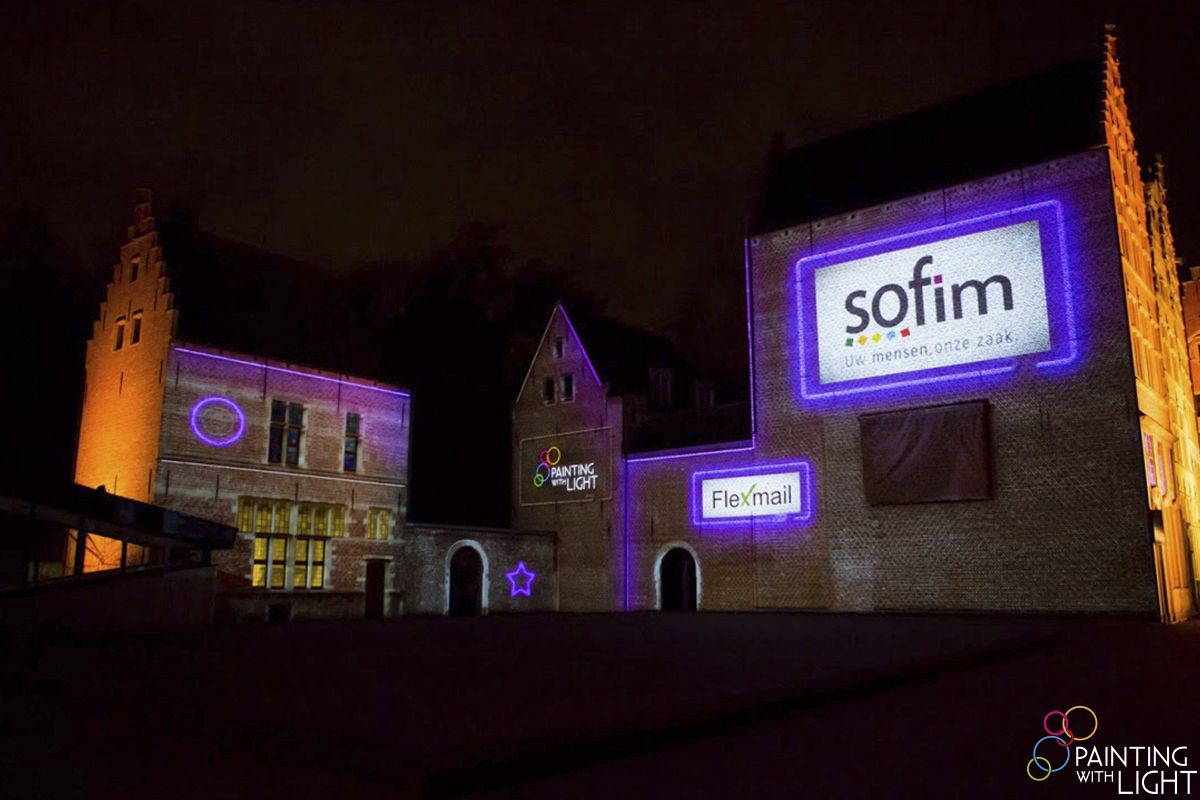 For The Party of the Entrepreneur we chose the exclusive way. The 3D-mapping to the Hangar 58 reassured the experience, emotion and inspiration, our values. The 3D mapping is a new technology. The installation of this 3D mapping technology is a first one in Belgium. We undertook a full 3D scan of the building's facades before making the multi-million pixel 'map'. After, we started work on the content together with Bart Tauwenberg from New Solid, looking for an entertaining, humorous approach. Luc commissioned Jo Pauly and Michel Stroobants from Visual Solutions to complete the d3 media server programming and projector alignment. We translated our vision to a personalized story for the video content. The story of the entrepreneur: falling, standing up again and continue to grow. Therefore we projected walls that break down and get rebuilt on the buildings for example. But you also saw a firework display to celebrate the power of all entrepreneurs. Having two seperate surfaces offers great possibilities to split the images and tell the story with contrasting and complimentary images.