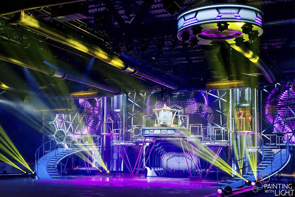 Michael created the content, a process that involved commissioning a concept artist to sketch out the two worlds according to the brief and mood-board. A 3D modeller then translated the 2D sketches into 3D using Cinema 4D and as the scenes started to take shape, Michael started texturing and lighting the material. All video is programmed by Painting with Light’s Katleen Selleslagh on Coolux mediaservers and lighting is programmed on a GrandMA 2 by Arjan Grootenhuis.