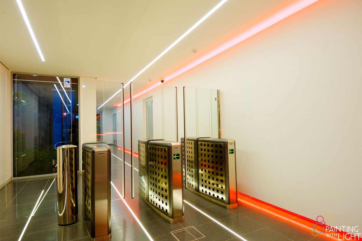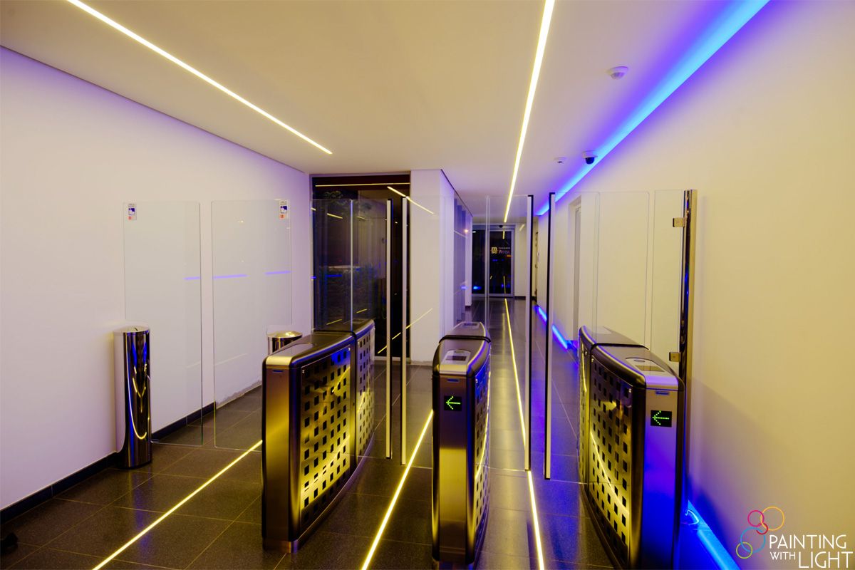 Long ledlines integrated into the floor and ceiling guide personnel past the security gates and toward the dressing rooms, while at the same time providing ambient lighting. A dash of colour was added with the inclusion of RGB leds tucked away in coves and built into the security office counter.