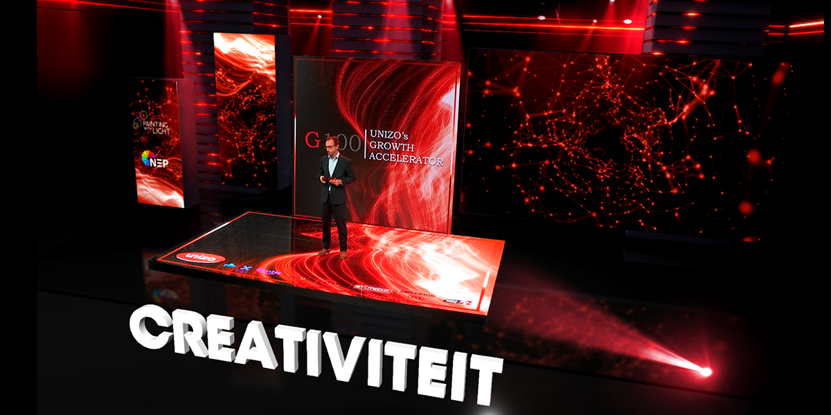 The Virtual Event Studio dynamics are enhanced with a real – physical – high resolution 3 x 3 meter LED wall, putting the presenter in front of a virtual background for a higher quality end result and better visual coherence. A complete video floor below the presenter stage adds further visual dynamics. The other screens are all virtual, however, several smaller physical screens in the studio allow presenters to see and review the content on both physical and virtual surfaces. This improves participation and interaction with the audience. The 10 x 19 meter recording area is fully equipped with the professional audio & broadcast technologies by NEP Belgium. As lighting and entertainment specialist, Painting with Light applies spectacular and advanced lighting technologies with an adaptable lighting rig offering production extensive tools. While all is fully customizable to client needs, for versatility, speed, and efficient operation, several pre-designed event stages and spaces are also available for different styles and occasions, each of which can be individually branded. 3D assets and the design of any physical event, studio, trade show booth, etc can be imported from a CAD file and replicated integrating the client’s own environment and product design.